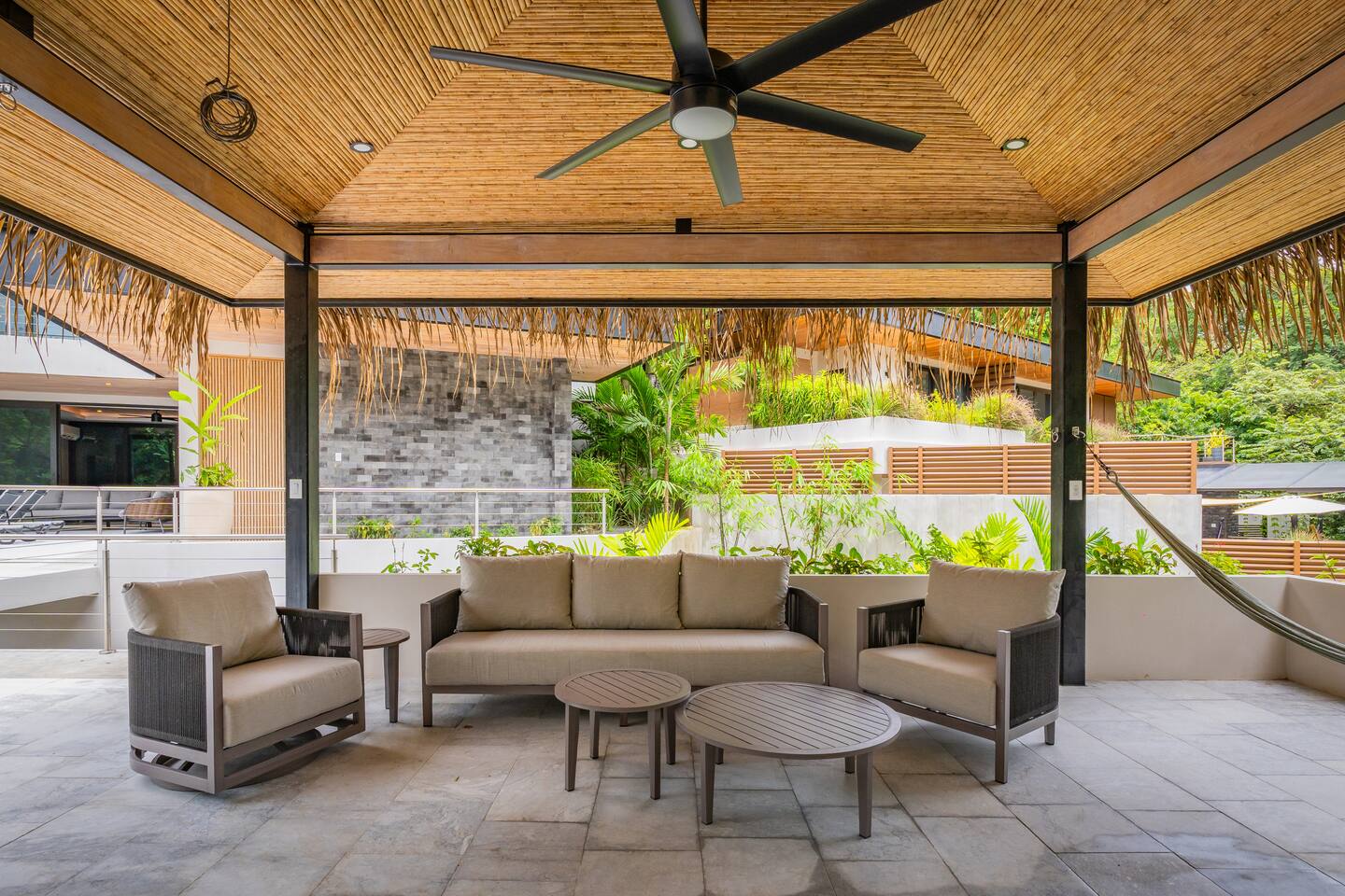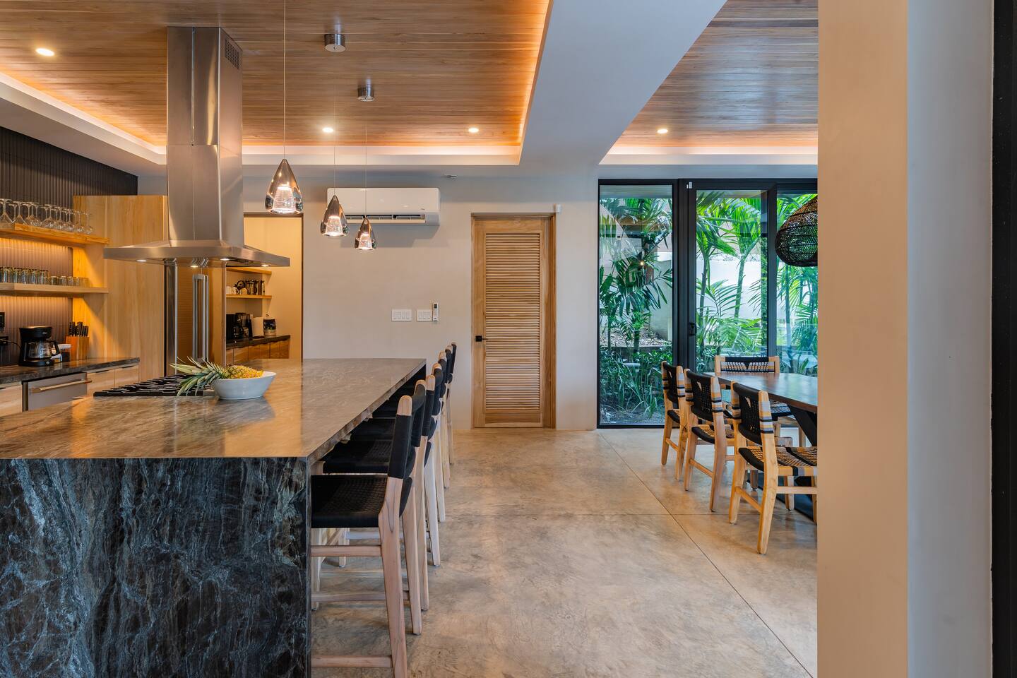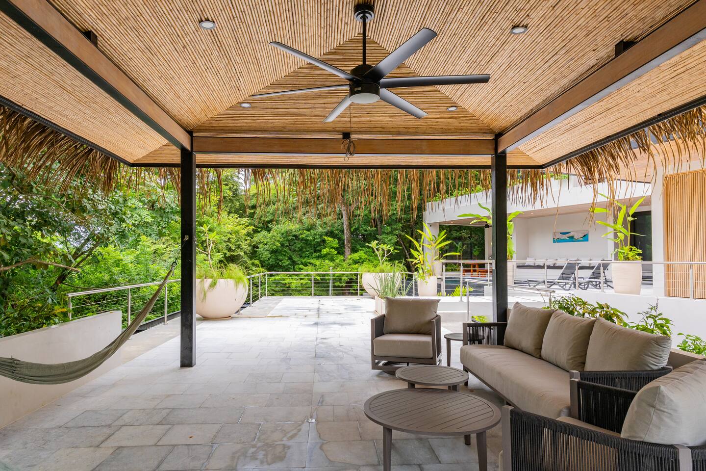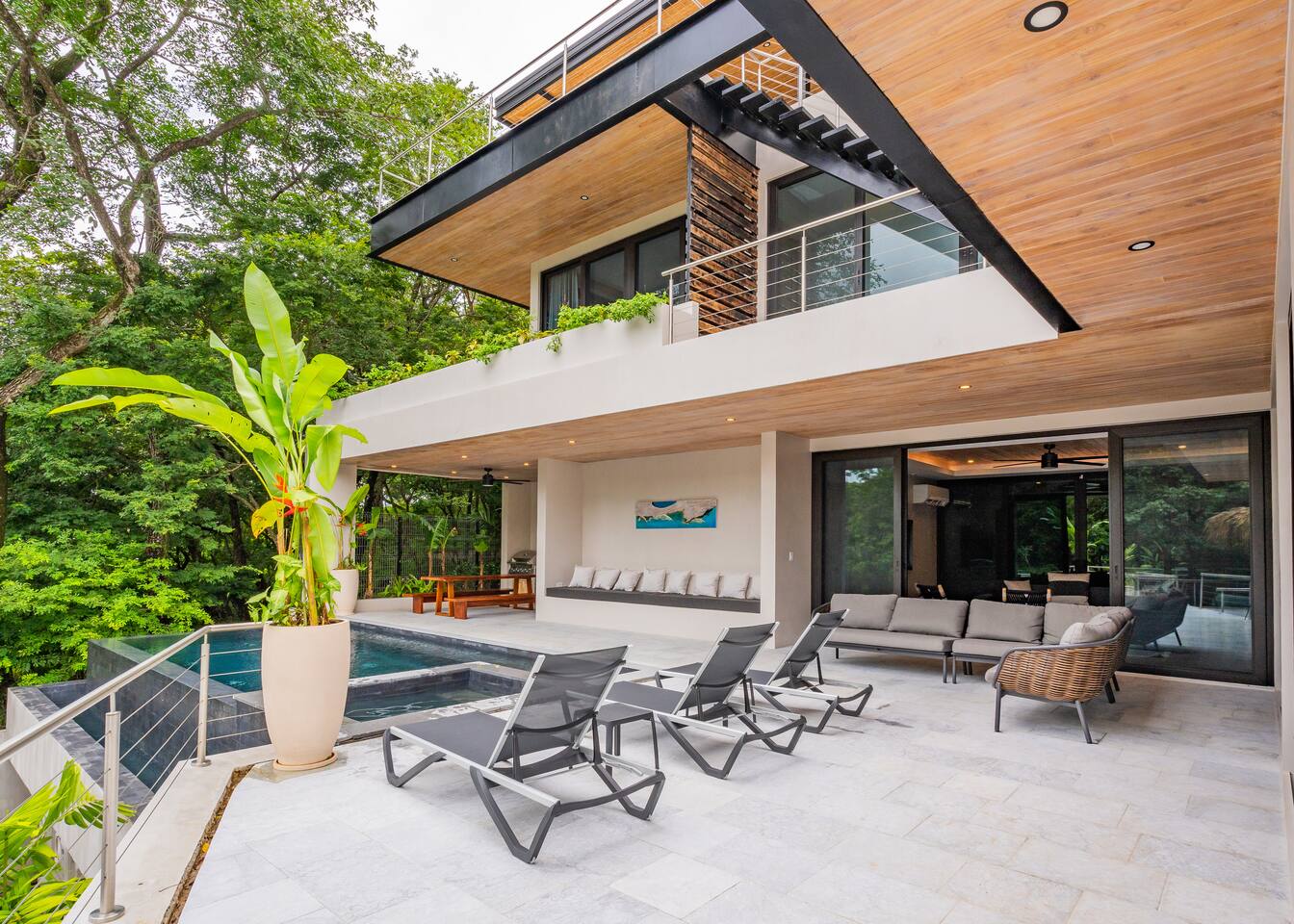 Casa Pipeline – Luxury Playa Guiones Villa with Pool, Jacuzzi & Ocean-View Yoga Deck Experience the perfect blend of style, comfort, and location at Casa Pipeline, a stunning 4BR/4.5BA modern villa inspired by Hawaii’s legendary Pipeline wave. Just a 7-minute walk to Playa Guiones, this luxury vacation rental is designed for surf trips, yoga retreats, and unforgettable group getaways in Nosara, Costa Rica. Each spacious suite features its own ensuite bath and flexible bed setup – choose a King or two Twin XLs in every room. Additional sleeping space includes a Queen pull-out sofa upstairs and a custom bunk room with two Queens and two Twins, bringing total capacity to 14 guests. Start your day on the ocean-view yoga deck (fully equipped for 20), take a dip in the private saltwater pool and jacuzzi, or rinse off in the outdoor shower after a surf session. The chef’s kitchen is stocked with stainless steel cookware, and the open indoor-outdoor living spaces make entertaining easy. Our local concierge team can arrange airport transfers, private chefs, surf lessons, yoga instructors, spa treatments, stocked groceries, and adventure tours—making your Nosara stay seamless and unforgettable. Highlights: * 4BR / 4.5BA modern luxury villa * Sleeps 14 comfortably * 7-minute walk to Playa Guiones surf * Ocean-view yoga deck for 20 * Private saltwater pool & jacuzzi * Ensuite baths in all bedrooms * Flexible King/Twin XL setups * Chef’s kitchen with stainless steel cookware * Outdoor shower & 2-car garage * Fast WiFi & A/C throughout Traveling with a larger group? Casa Pipeline can be booked together with Casita Back Door – a 2BR/1BA guesthouse that sleeps 6 with a full kitchen and living room – or with Casa Rocky Point, a luxury villa next door that sleeps 12 and is connected via a gated driveway. Combined, these homes can host retreats, weddings, reunions, or surf camps for groups of 30+ guests. Discover why Nosara is one of Costa Rica’s most sought-after destinations – and make Casa Pipeline your base for an unforgettable luxury beach getaway.